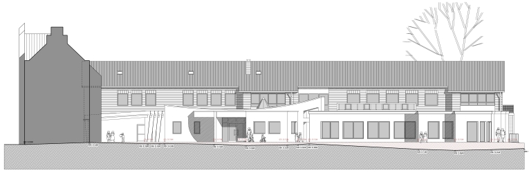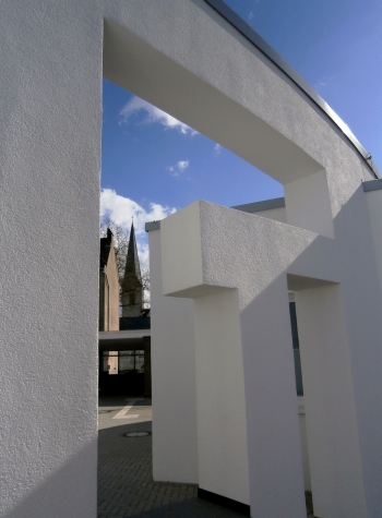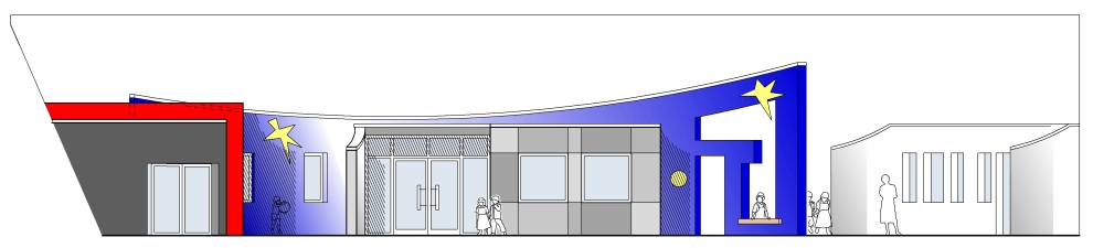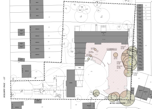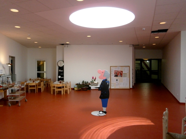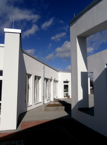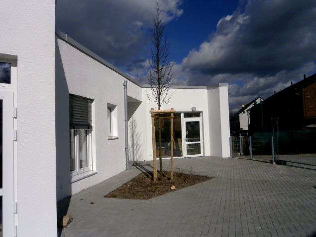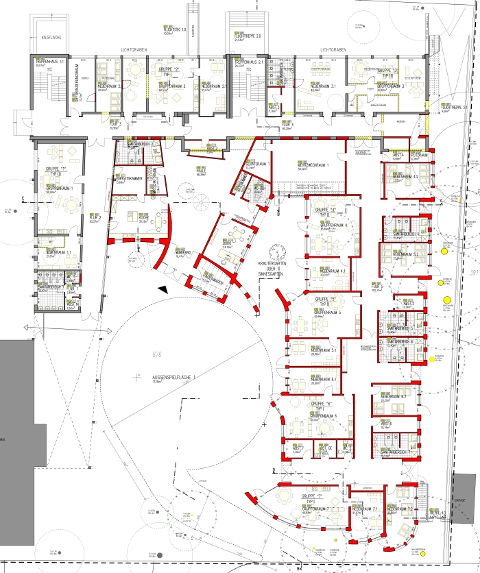 werden 31 Plätze für Kinder unter 3 Jahren geschaffen. Der Bestand verfügt über eine Bruttogrundfläche von rd. 1.684,00 m², die geplante Erweiterung hat eine Bruttogrundfläche von 1.088,00 m². Neben dem Ausbau des Betreuungsangebotes für unter 3-jährige mit entsprechenden Räumlichkeiten ist die Verlegung der im Souterrain des bestehenden Schulgebäudes befinden 3 Gruppen, in das Erdgeschoss des Neubaus, die Errichtung eines 2. Mehrzweckraumes, die Erweiterung und Verlagerung der Küche und des Büros der Leiterin und die Schaffung eines adäquaten Eingangsbereiches beabsichtigt. Das heute als Kindertagesstätte genutzte, ehemalige 3-geschossige Schulgebäude liegt in Nord-Süd-Ausrichtung in etwa mittig im Baugrundstück. Nördlich der Tagesstätte befindet sich der ehemalige Schulhof mit Asphaltflächen. In diese Richtung orientiert sich auch der geplante Neubau in Nord-Süd-Ausrichtung an der westlichen Grundstücksgrenze. Das innere Erschließungssystem baut sich entsprechend der Größe der Tagesstätte, wie eine kleine Stadt mit Orientierungsplätzen innerhalb der Flurzonen vor den Gruppeneinheiten und der Eingangshalle, als Hauptplatz auf. Zur Auflockerung und kindgerechter Gestaltung werden dem strengen Schulgebäude zum Innenhof der Außenspielfläche hin geschwungene Wandformen entgegen gesetzt. |