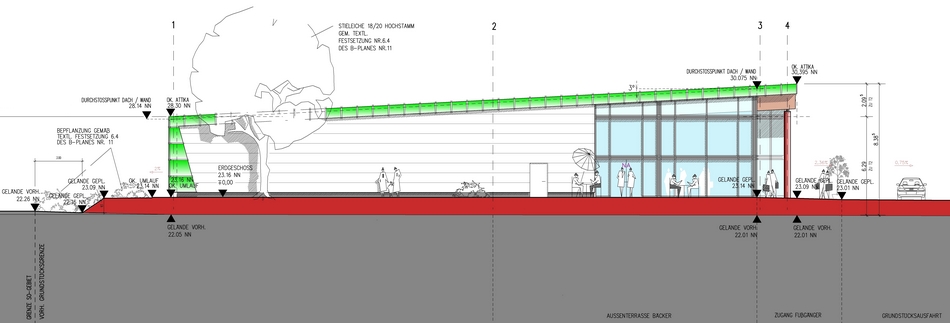 | Errichtung eines EDEKA-Markt Rheinberg-Orsoy, Südlich der Rheinberger Straße Neubau eines großflächigen Lebensmittelmarktes als Vollsortimenter der Handelsgruppe Edeka und Errichtung von 100 Stellplätzen |